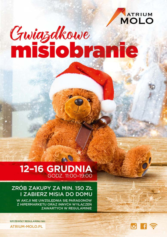 Z okazji zbliżających się Świąt Bożego Narodzenia Atrium Molo przygotowało dla swoich klientów wyjątkową akcję „Gwiazdkowe Misiobranie”. Odwiedzający centrum handlowe, którzy w dniach 12 – 16 grudnia dokonają zakupów za minimum 150 zł, będą mogli odebrać jednego ze specjalnej edycji misiów.