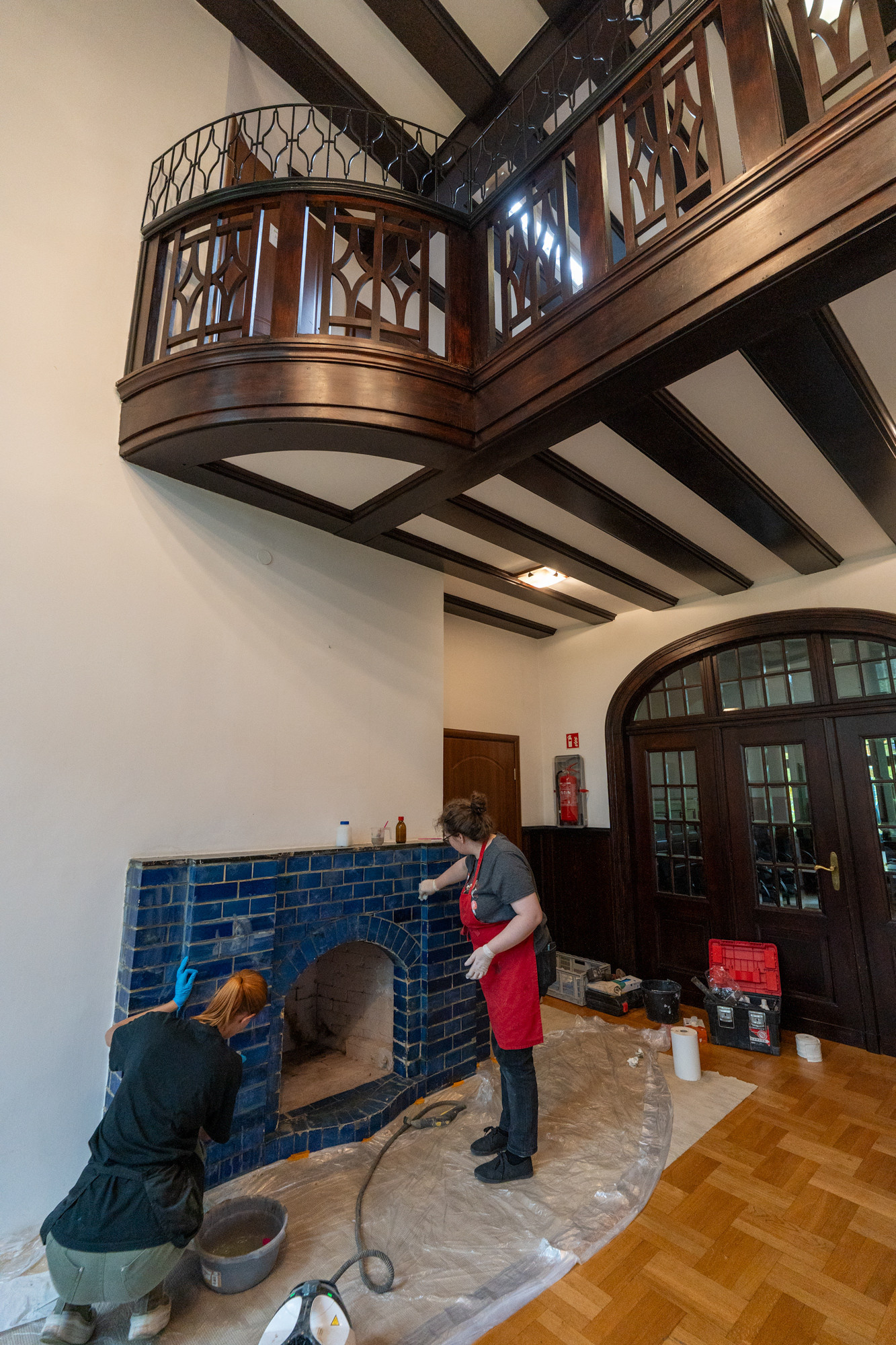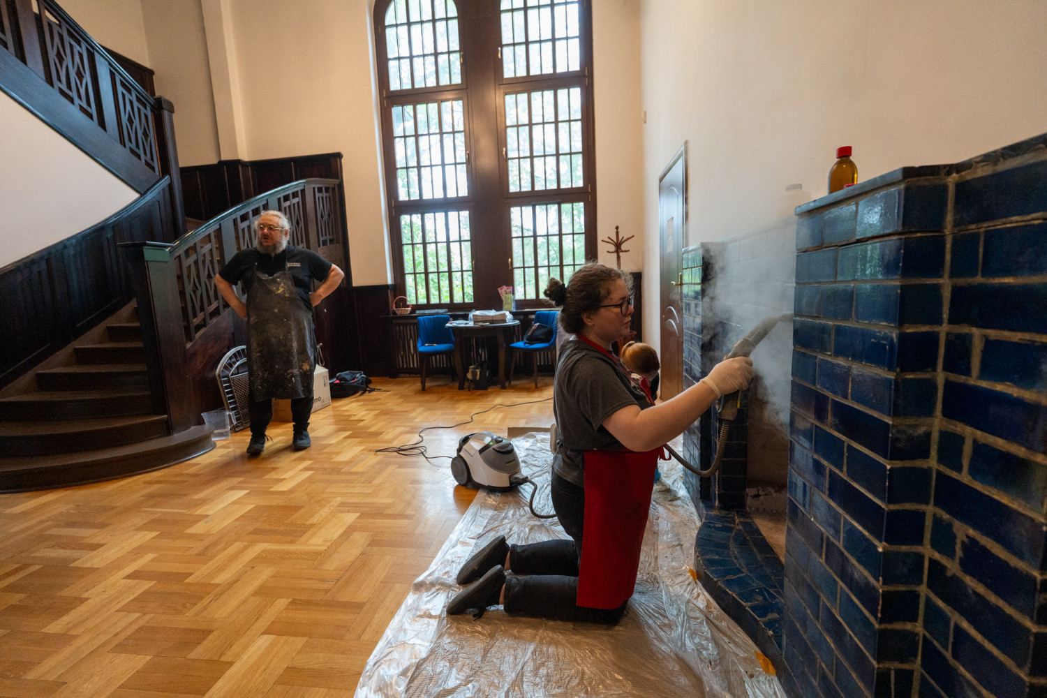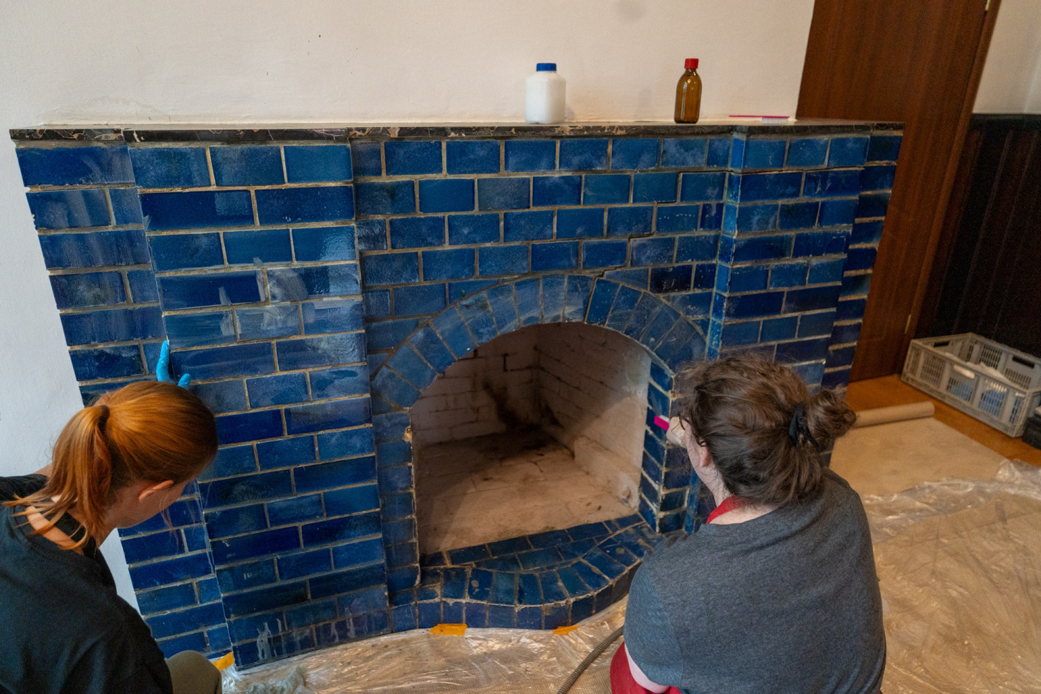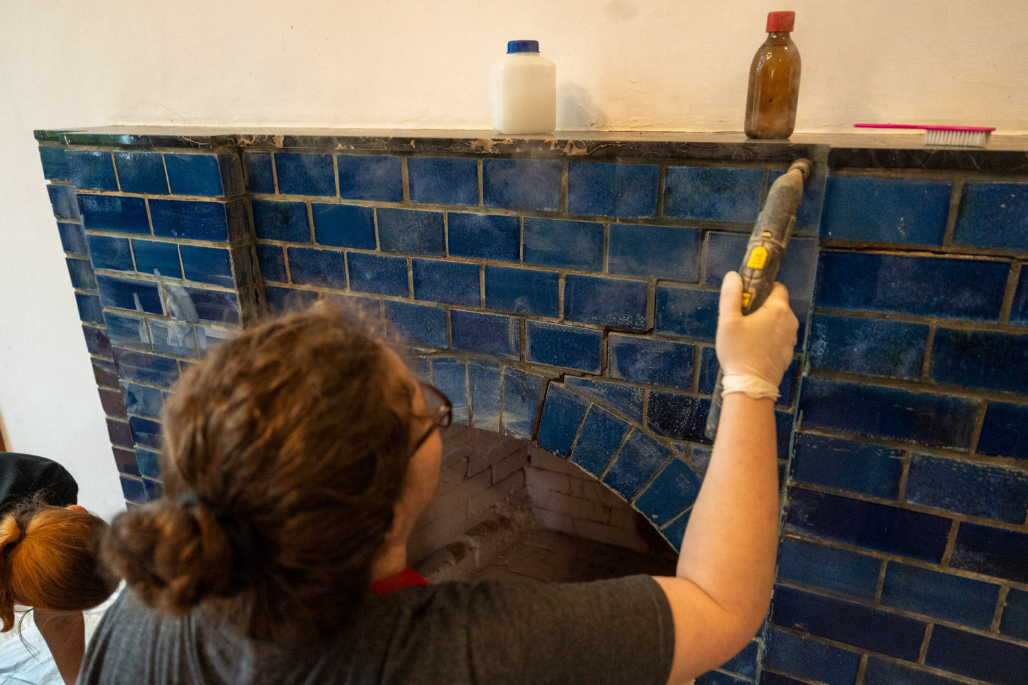 – Zaczęliśmy od mycia. Spoiny miały na sobie kilka warstw farby w różnych odcieniach. Ujawniło się też pęknięcie, które przebiegało przez pół kominka. Zajęliśmy się zniszczeniami, które musieliśmy zrekonstruować. W nie najlepszym stanie były choćby krawędzie cegieł przy samym palenisku – relacjonuje Maria Grzybek, mgr sztuki, ceramiczka i konserwatorka.