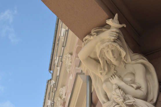 Wyjątkowo bogaty detal obu fasad nawiązuje do miejskich „palazzi” wznoszonych we Włoszech w czasach renesansu. Charakterystycznym motywem dla szczecińskiej kamienicy jest narożny, trójkondygnacyjny ryzalit podtrzymywany przez mitologiczne postaci - muskularnego Herkulesa z maczugą i lwią skórą oraz Demeter trzymającą pochodnię. Warto dodać, że wystrój jednej z klatek w kamienicy również nawiązuje do posągów znajdujących się nad piekarnią.