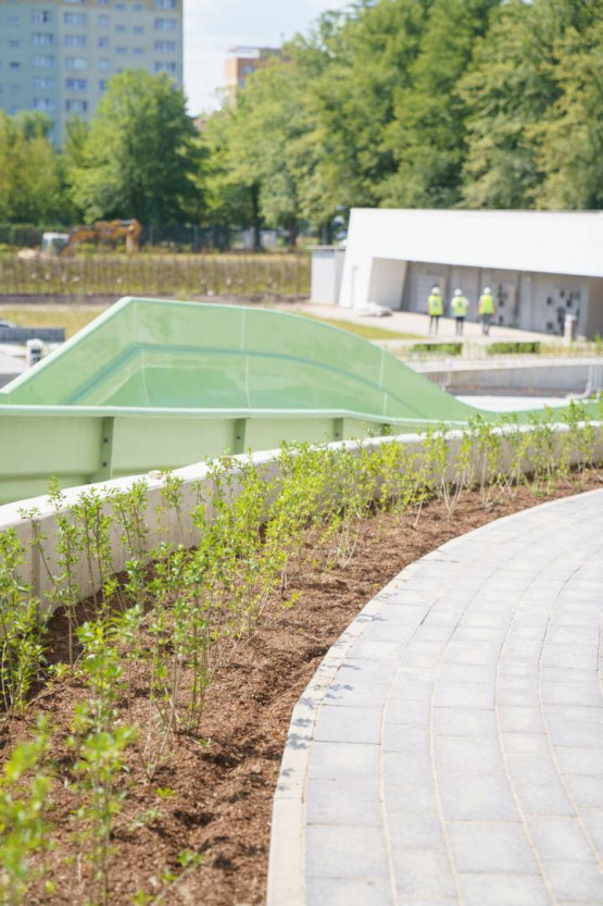 – Aktualnie wykonywane są prace malarskie i prowadzony jest końcowy montaż sufitów w strefach gastronomicznych czy biurowych. Prace wykończeniowe realizowane są w nieckach basenowych. Montowane jest oświetlenie, kamery i głośniki. Na zewnątrz wykonywane jest humusowanie terenu wokół boiska piaszczystego, prowadzony jest obsiew i pielęgnacja już wykonanych nasadzeń. Montowane są balustrady i trwa poprawianie elewacji budynku – informuje Piotr Zieliński, rzecznik prasowy miejskiej spółki Fabryka Wody.