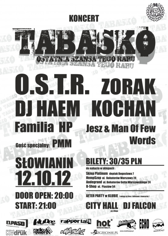 12 października nie zabraknie również reprezentacji Szczecina. Fani będą mogli obejrzeć występy duetu Jesz & Man Of Few Words oraz gości specjalnych: Głowy i Węża z grupy PMM. Pierwsi zagrają materiał z wydanej nakładem wytwórni Re4mat Records epki zatytułowanej ”Sprawdź EPke” oraz premierowe numery z nowego albumu, który ukaże się jeszcze w tym roku. Drudzy w natłoku prac związanych z nagrywaniem czwartego już krążka, który wyprodukuje O.S.T.R., znaleźli czas, aby po raz kolejny zaprezentować się przed szczecińską publiką. W związku z obecnością na piątkowej imprezie wspomnianego łódzkiego rapera i producenta fani będą mogli go usłyszeć nie tylko w ramach Tabasko, ale także w trakcie wykonania przez PMM swoich największych hitów powstałych przy jego udziale, tj. ”Daj mi bit”, ”Poza horyzont” i ”Wstawaj”.