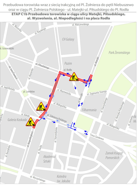 – zamknięte pozostanie torowisko tramwajowe wzdłuż al. Wyzwolenia na odcinku od ulicy Piłsudskiego do placu Żołnierza, wzdłuż al. Niepodległości oraz w ciągu ul. Piłsudskiego na odcinku od placu Rodła do Matejki;