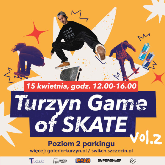 W sobotę – 15 kwietnia od godz. 12.00 do 16.00 zapraszamy do Galerii Turzyn. Przed nami ekscytujące, pełne brawury i finezji zawody Game of SKATE vol. 2! Nasz parking na poziomie 2 zmieni się w wielką arenę do gry w SKATE. Organizatorami rozgrywek są Stowarzyszenie Sportowe SWITCH i Akademia Deskorolki.