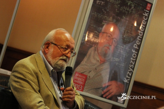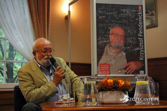 Podczas spotkania zw Hotelu Park, które poprowadził Leszek Szopa, pierwsze pytanie dotyczyło wcześniejszych styczności jubilata (w tym roku obchodzącego 80-lecie urodzin) w Szczecinie. Kompozytor wspomniał niezwykłe wykonanie "Requiem polskiego", w hali Stoczni Szczecińskiej w 2005 roku .„To było dla mnie bardzo ciekawe doświadczenie. Nie spodziewałem się, że w takim miejscu można zorganizować koncert, ale akustyka była bardzo dobra. Jedynym mankamentem była nietypowa temperatura. Minus pięć stopni to dla muzyków, duże wyzwanie. Sam też trochę zmarzłem”.