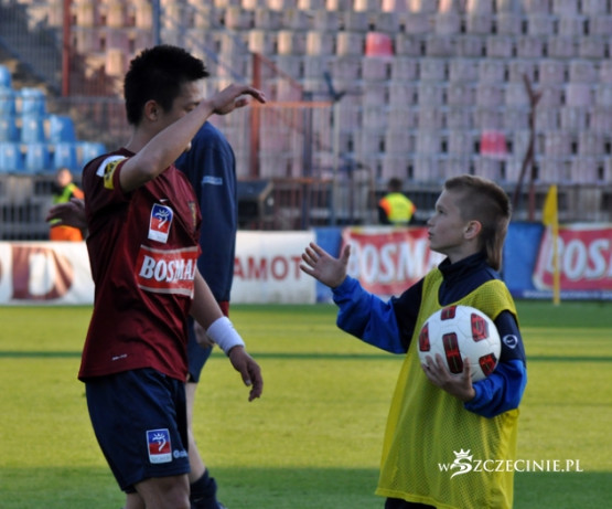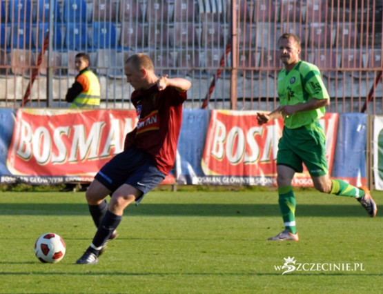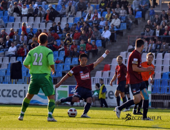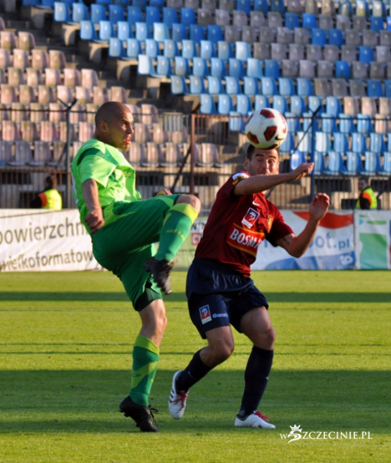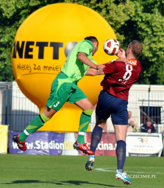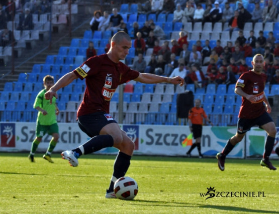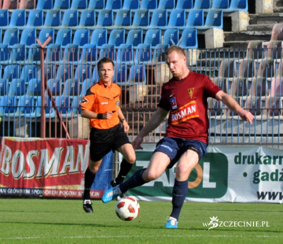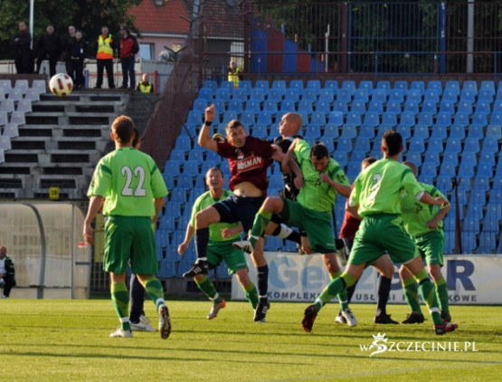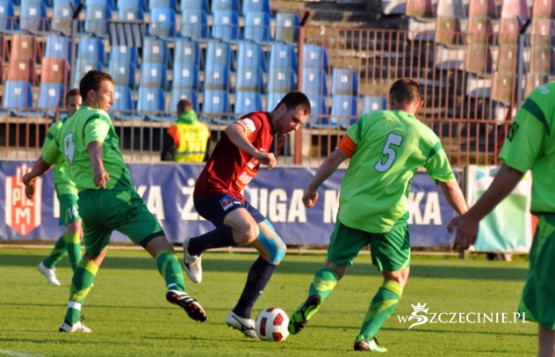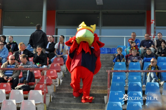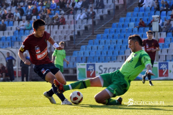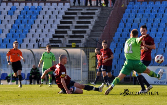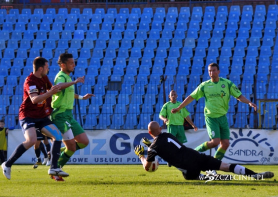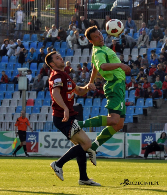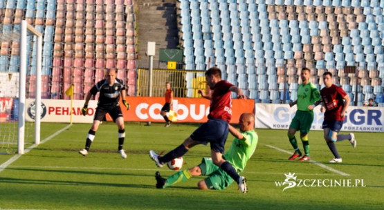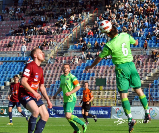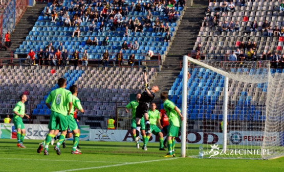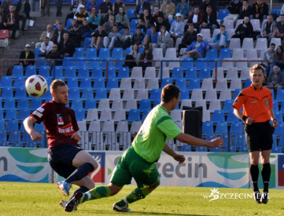 Nie zdążyła upłynąć pierwsza minuta od gwizdka rozpoczynającego spotkanie I ligi piłki nożnej, a Pogoń Szczecin straciła bramkę. Najsmutniejsze było to, że to właśnie szczecińscy zawodnicy rozpoczęli spotkanie 31 kolejki. Po tak niefortunnej stracie kibice zaczęli skandować imię drugiego bramkarza: „Radek Janukiewicz” - z całą pewnością nie dodało to otuchy stojącemu między słupkami Bartoszowi Fabiniakowi. Po stracie Portowcy znów od środka i sytuacja się powtarza, nieudolne rozpoczęcie, zawodnicy z Polkowic przejmują piłkę, zbliżają się do pola karnego i ... tym razem było tylko blisko. Pierwsze dziesięć minut spotkania w Szczecinie wyglądało tak, jakby po boisku biegała tylko jedenastka Górnika, Portowcy nie potrafili się odnaleźć, na każdym kroku gubili piłkę i tylko ogromne szczęście uchroniło ich przed kolejną stratą. Po dziesięciu minutach gra do jednej bramki powoli zaczęła się przemieniać w nieśmiałe akcje Pogoni. Ale nadal niegroźnie, bez pomysłu i polotu. Po dwudziestu minutach nudnej gry Pogoń w końcu oddaje pierwsze niedokładne strzały w stronę bramki rywali. Próby zaatakowania piłkarzy Górnika Polkowice w 26 minucie przyniosły bramkę dla Portowców ! Po dośrodkowaniu Pietruszki piłkę głową strącił Wólkiewicz i zdobył dla Pogoni Szczecin wyrównanie. Po zdobytym golu szczecinianie w końcu zaczęli grać lepiej – jednak do zadowolenia z gry wiele brakowało. Należy również wspomnieć, że to nie tylko nie był najlepszy mecz Dumy Pomorza, gorszy dzień mieli także sędziowie, którzy co krok podejmowali niezrozumiałe decyzje. Jak chociażby ta z 40 minuty, gdy żółtą kartką został ukarany Daniel Wólkiewicz po faulu... właśnie na tym zawodniku. Żółty kartonik do reszty rozwścieczył kibiców. Do gwizdka kończącego pierwszą połowę gra obu drużyn nie przyniosła ani bramek, ani ujmujących akcji. Nuda, nuda i jeszcze raz nuda. Jednak w czasie przerwy w szatni gospodarzy Artur Płatek musiał udzielić swoim piłkarzom ostrej reprymendy, na drugą połowę wybiegł całkowicie odmieniony zespół. Tym razem od pierwszych sekund po gwizdku to Portowcy przejęli inicjatywę i to oni dyktowali warunki gry, taka presja już trzy minuty po rozpoczęciu przyniosła Pogoni prowadzenie. Klatt pięknie wyprowadza skrzydłem piłkę, dośrodkowanie dochodzi do Ławy strzał ! Jeszcze bramkarz Górnika wybija uderzenie Portowca, ale piłka trafia pod nogi Akahoshiego, który ze spokojem dobija i podwyższa wynik na 2:1. Na kolejną bramkę kibice nie musieli długo czekać, bo już dwie minuty później bramkarz z Polkowic znów musiał wyciągać piłkę z siatki. Tym razem winny był obrońca Górnika, który będąc w swoim polu karnym z łatwością dał się ograć Akahoshiemu, a ten podniósł wynik na 3:1. Strata dwóch bramek w przeciągu 5 minut po rozpoczęciu drugiej połowy nie przygnębiła do końca zawodników Górnika, którzy podjęli walkę i w 53 minucie zdobyli drugiego gola. Po przypadkowym zdobyciu piłki Tumicz wychodzi na pozycję sam na sam z bramkarzem i pewnie pokonuje Fabiniaka. Na ponad 30 minut przed końcem 3:2 dla Pogoni Szczecin.