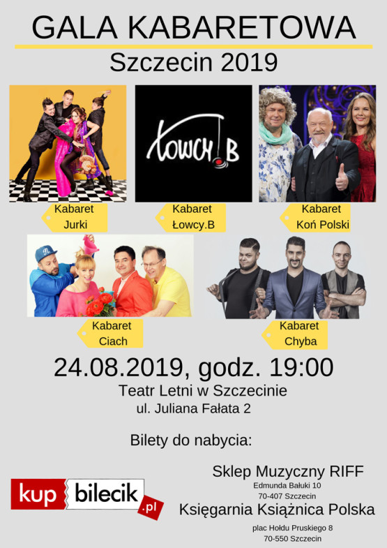 Bilety na galę są do kupienia w Szczecinie w sklepie muzycznym Riff (ul. Bałuki 10) oraz w Księgarni Zamkowej (pl. Hołdu Pruskiego 8) lub drogą elektroniczną: www.kupbilecik.pl/imprezy/36341/Szczecin/Gala+Kabaretowa+-+Szczecin+2019/.