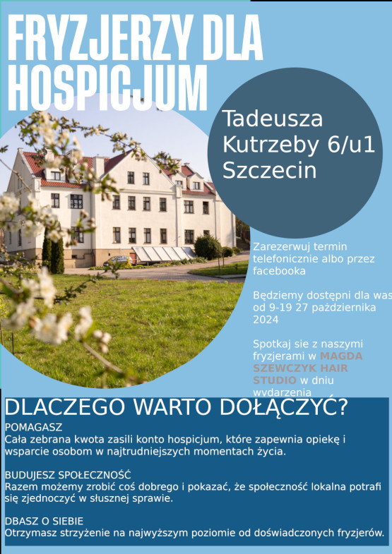 Akcja „Fryzjerzy dla hospicjum” organizowana jest przez salon Hair Studio przy ul. Kutrzeby 6/u1. Aby wziąć w niej udział, wystarczy skontaktować się z salonem przez Facebooka lub umówić bezpośrednio na miejscu.