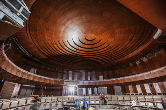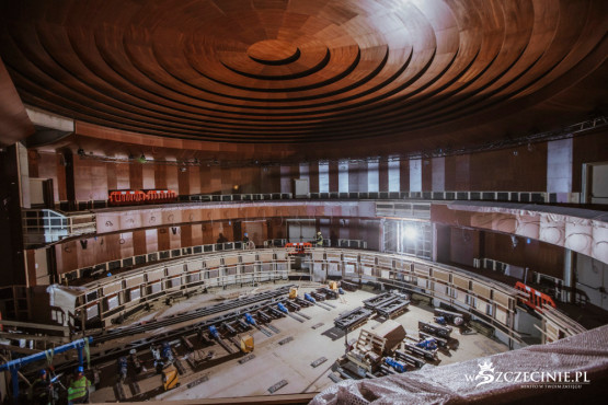 Gotowe są konstrukcje sceny i tworzącej półokrąg widowni. Wnętrza wypełniają już drewniane okładziny wraz ze żłobionymi ekranami akustycznymi. Na balkonach znajdzie się około 240 miejsc, ponad drugie tyle będzie mogło być na widowni w parterze.