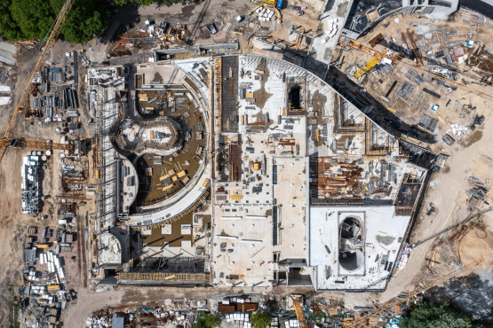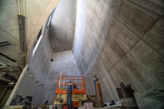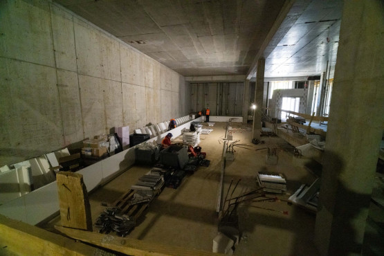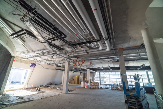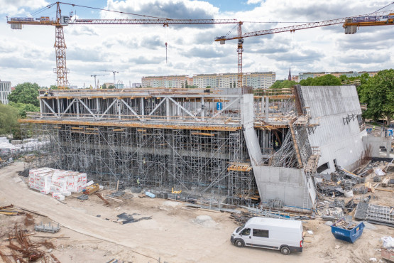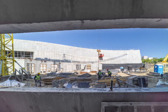 W edukatorium budowlańcy zajmują się już robotami posadzkowymi na pierwszym i drugim piętrze. Trwają też prace montażowe instalacji sanitarnych i teletechnicznych i malowanie przeciwpożarowe stalowej kuli. Zaczyna powstawać łącznik między budynkami.