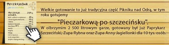 Niewątpliwie jednym z najbardziej oczekiwanych punktów programu będzie gotowanie regionalnej potrawy w olbrzymim garze o pojemności 2 500 litra. Podczas poprzednich edycji  były to m.in. Paprykarz Szczeciński, Zupa Rybna oraz Zupa Anny Jagiellonki. W najbliższą sobotę (około 14.30) rozpocznie się degustacja zupy Pieczarkowej po szczecińsku (jej przygotowanie „pochłonie”  oprócz czasu, także  m.in. ćwierć tony grzybów, 40 kg cebuli i 32 łazanek). Wydane zostanie około 10.000 porcji.