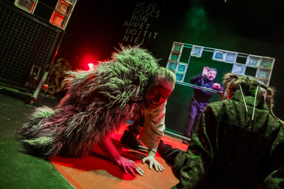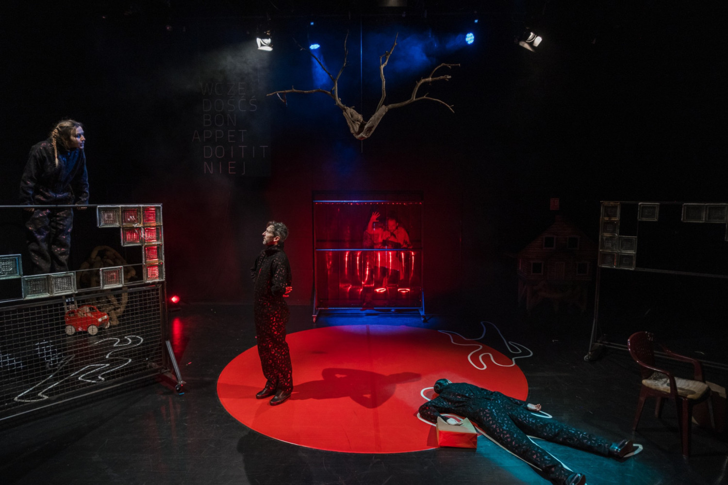 Odrysowane białą kredą kontury, które widzimy na podłodze sceny, od początku wskazują jednoznacznie, że w tej historii będą ofiary. Akcja spektaklu rozwija się w dość nietypowy sposób, bo co kilka minut cofamy się wraz z bohaterami do czasu wcześniejszego, a następnie jeszcze wcześniejszego i tak dalej. To sposób na to, by przeanalizować dogłębniej powody zbrodni. Pomóc w tym może także narrator, czyli stwór kreowany przez Macieja Sikorskiego (w kostiumie wikinga, „dzikiego człowieka” z demonicznym wzrokiem).