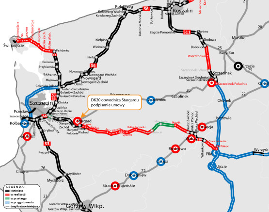 – obwodnica Stargardu w ciągu DK20 (podpisano umowę na zaprojektowanie i budowę);