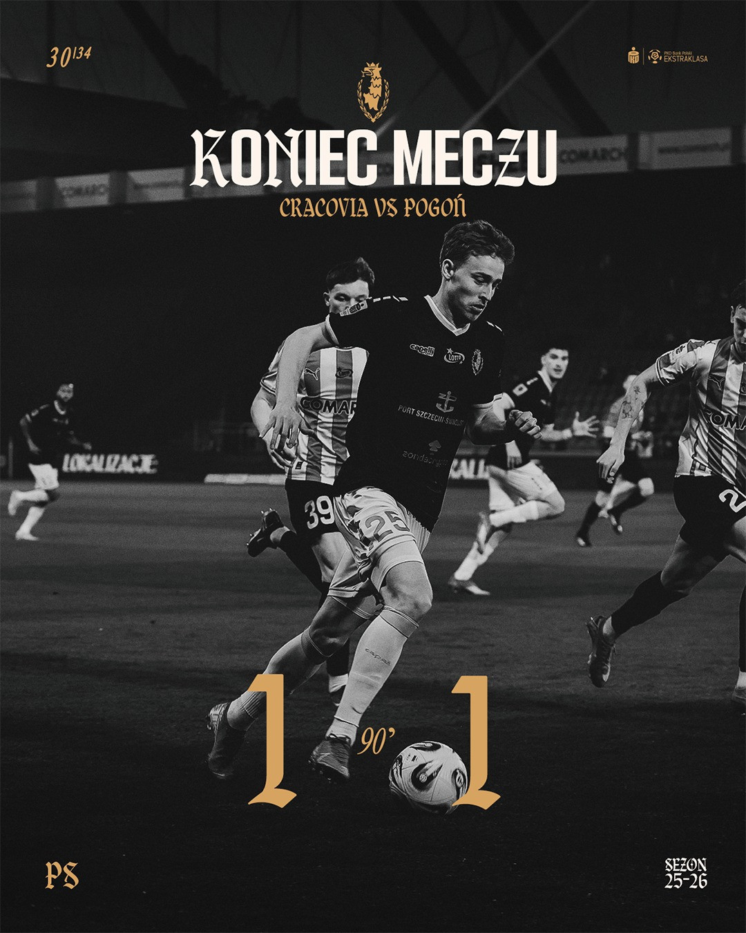Pogoń Szczecin zremisowała z Cracovią 1 do 1. Przez większość spotkania to Portowcy prowadzili jednym trafieniem. Nie udało im się jednak wywieźć trzech punktów z Krakowa. Mogło to być bardzo ważne zwycięstwo w kontekście zagwarantowania sobie utrzymania w PKO BP Ekstraklasie. Portowcy mają na koncie 38 punktów. Do końca rozgrywek zostały cztery mecze.