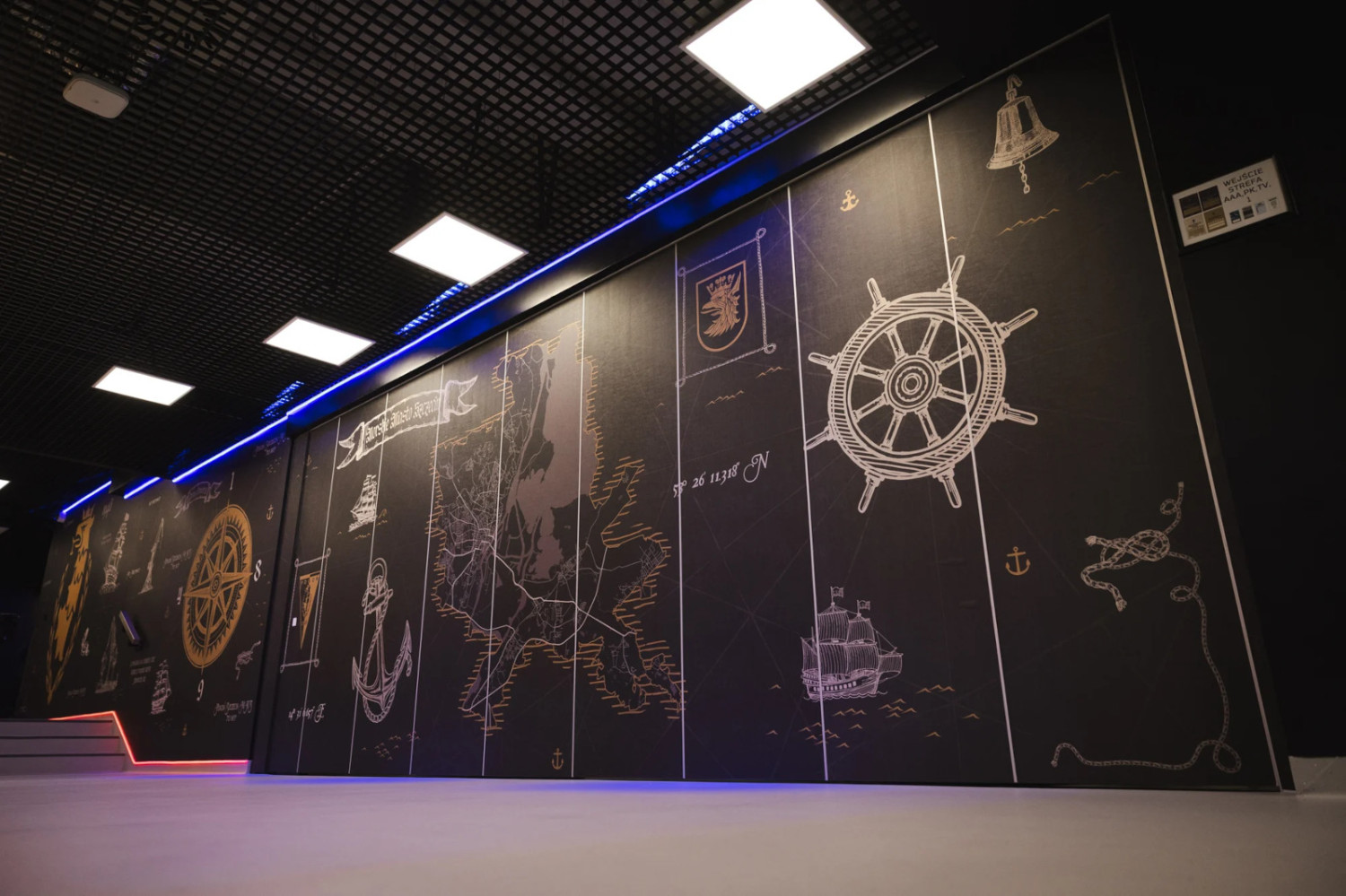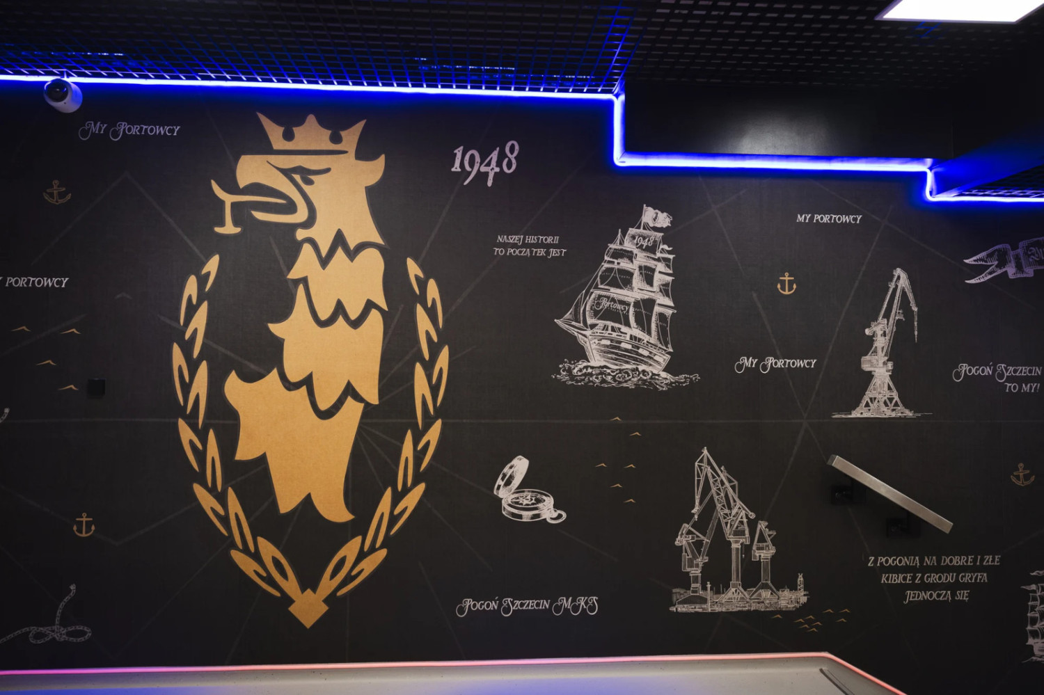 Nowy tunel to nie tylko element funkcjonalny, ale również silny nośnik klubowej tożsamości. Jego oprawa wyraźnie nawiązuje do morskiego charakteru Szczecina i przydomka zespołu. Jedna ze ścian przedstawia mapę inspirowaną dawną kartografią żeglarską, łącząc symbole Pogoni z historią miasta portowego. Druga utrzymana jest w industrialnym stylu, przywołując skojarzenia ze stalową burtą statku i stoczniowym dziedzictwem regionu. Centralnym punktem przestrzeni jest podświetlany herb Pogoni Szczecin.