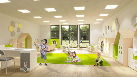 Obiekt będzie miał dwie kondygnacje, a także windę i otwarte wewnętrzne atrium. Oddziały przedszkolne, których łącznie ma być 14, zostaną rozlokowane zarówno na parterze, jak i piętrze. Na parterze zlokalizowany będzie również oddział klubu dziecięcego z wydzielonym osobnym wejściem.
