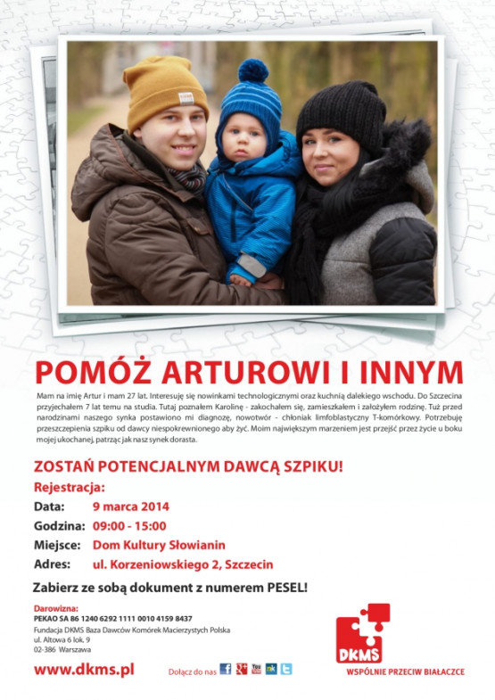 Jedną z osób, które potrzebują pomocy jest Artur Dobrowolski, u którego zdiagnozowano nowotwór – chłoniak limfoblastyczny T-komórkowy, który jest bardzo agresywną i rzadką odmianę choroby. Aby pomóc Arturowi oraz innym pacjentom, którzy czekają na dawcę, zorganizowana została akcja „Dzień Dawcy Szpiku w Szczecinie”.