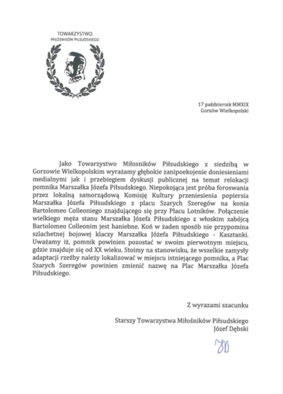 "Wyrażamy głębokie zaniepokojenie doniesieniami medialnymi i przebiegiem dyskusji publicznej na temat relokacji pomnika marszałka Józefa Piłsudskiego. Niepokojąca jest próba forsowania przez samorządową komisję kultury przeniesienia popiersia Marszałka z placu Szarych Szeregów na konia Bartolomeo Colleoniego znajdującego się przy placu Lotników" – czytamy w liście Towarzystwa Miłośników Piłsudskiego. "Koń w żaden sposób nie przypomina szlachetnej bojowej klaczy Marszałka Józefa Piłsudskiego Kasztanki. Uważamy, że pomnik powinien pozostać w swoim dotychczasowym miejscu, gdzie stoi od początku XX wieku" – czytamy dalej.