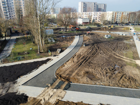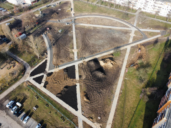 Już przygotowywana jest nawierzchnia pod trawniki. Trwa budowa palisady wokół przyszłego placu zabaw. Projektanci pomyśleli też o czworonogach.