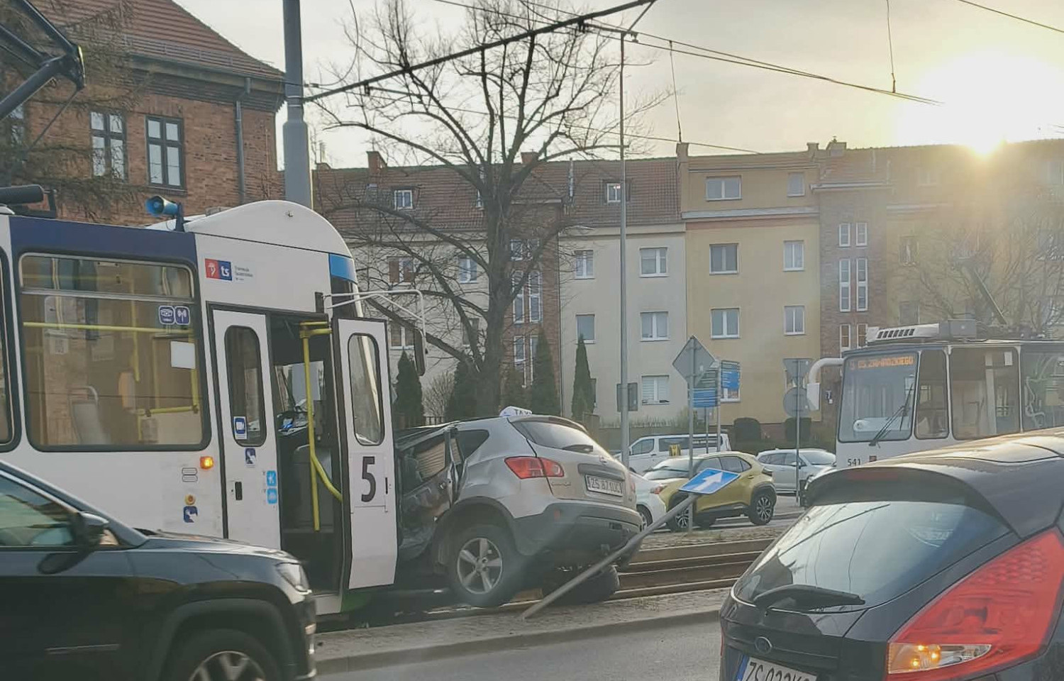 Do kolizji doszło po godzinie 7:15. Samochód osobowy zderzył się z tramwajem. Pojazd znajduje się na torowisku. Okoliczności zdarzenia są wyjaśniane.