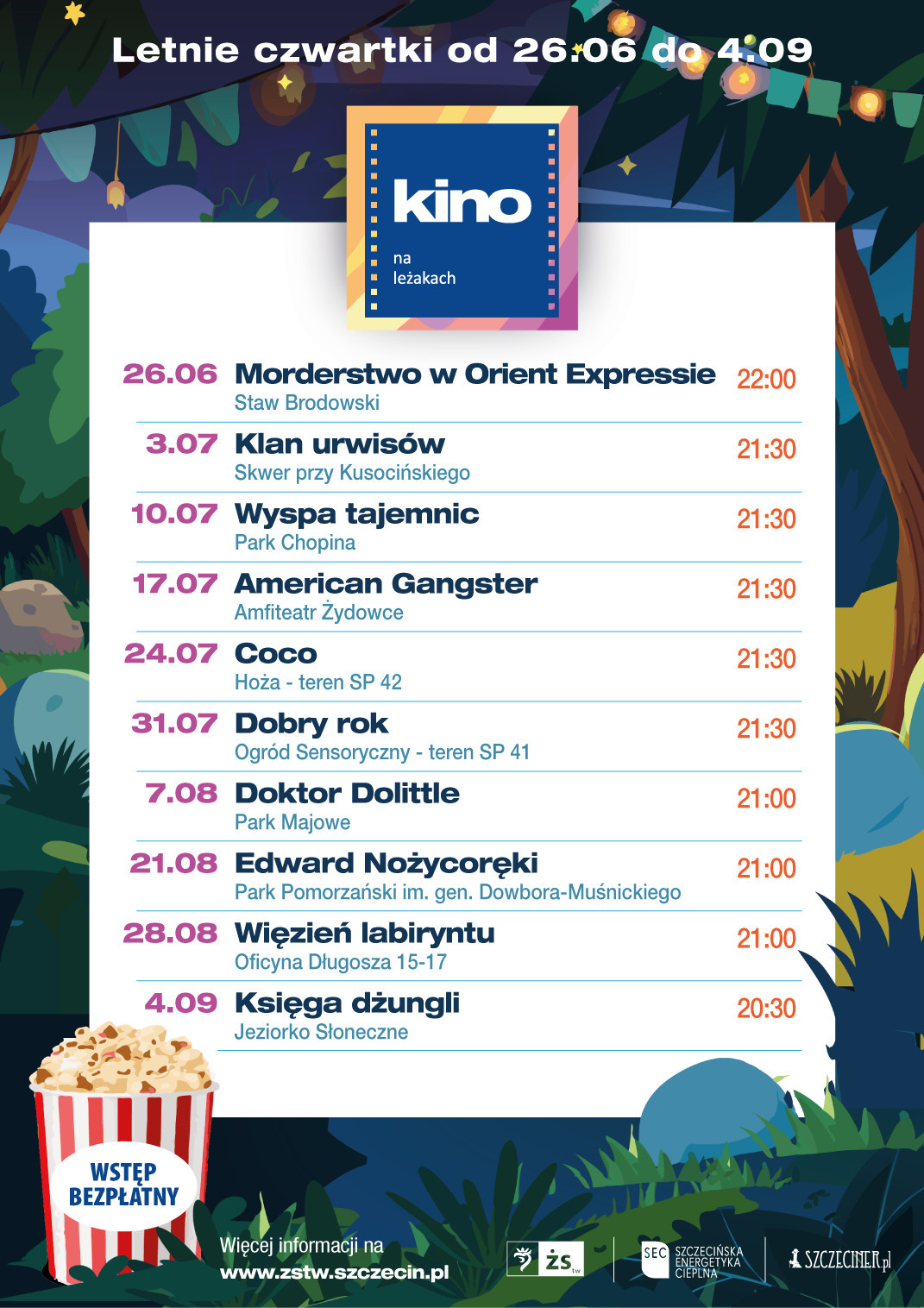Seanse będą odbywać się w każdy czwartek (z wyjątkiem 14.08) aż do 4 września. Na widzów czekać będą leżaki (około 100 sztuk), koce, preparaty na komary, a w razie deszczu – peleryny przeciwdeszczowe. Nie zabraknie też bufetu kinowego, w którym będzie można kupić popcorn i napoje (z możliwością płatności kartą). Wstęp oczywiście bezpłatny.
