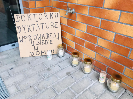 Na transparencie, który przynieśli ze sobą, można było przeczytać zdanie: „Doktorku, dyktaturę wprowadzaj u siebie w domu”. Z kolei na wieńcu znalazły się hasła „Stop segregacji sanitarnej” i „Dr Mengele Won”.