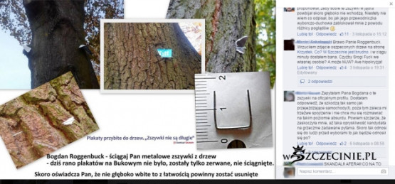 Jak tłumaczył kandydat na radnego sposób montowania nie szkodzi drzewom, a sam w ramach mandatu w przyszłości zajmie się zaniedbaną zielenią.