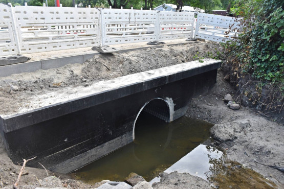 Obecnie ekipa wykonawcy skupia się na uzupełnianiu brakujących fragmentów chodnika w okolicach przepustu. Do wykonania pozostał jeszcze wlot. Zamontowane zostaną również bariery.
