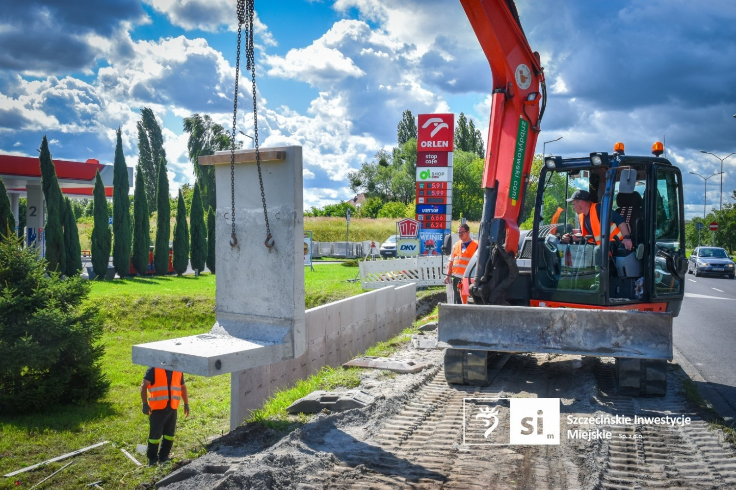 W pobliżu stacji paliw powstaje mur oporowy z prefabrykowanych elementów betonowych, który ustabilizuje teren, po którym będą przebiegać droga rowerowa i chodnik.
