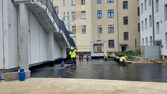 Na podobnym etapie są prace w budynku B, gdzie przewidziano biuro Szczecińskiego TBS, oraz budynku C , czyli „plombie” od strony ul. Małkowskiego. Cały czas trwają też roboty przy budowie garażu podziemnego oraz renowacja istniejących oficyn.