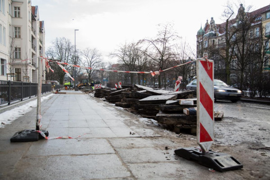 Historyczne, granitowe płyty zostaną zastąpione nowymi, ciętymi płytami kamiennymi. Remont chodnika trwa na odcinku al. Jana Pawła II między pl. Grunwaldzkim i ul. Mazurską.
