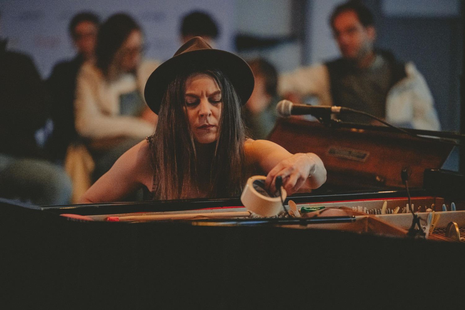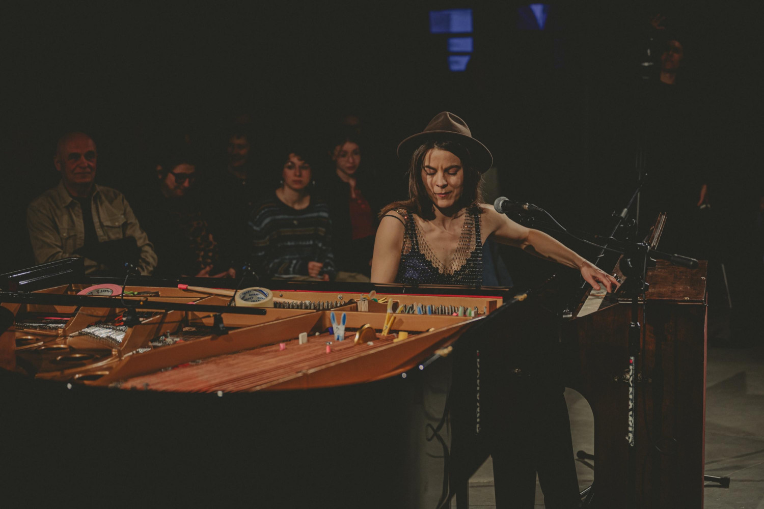 W centrum tego wieczoru znalazł się fortepian preparowany, instrument zmieniony fizycznie przez artystkę poprzez umieszczenie między strunami drobnych przedmiotów. Klamerki, śrubki, filc czy papier nie były tu dodatkiem, lecz narzędziem pracy z brzmieniem. Dzięki nim dźwięk tracił swoją klasyczną tożsamość, otwierając się na nowe barwy i faktury.