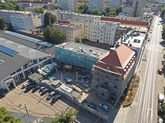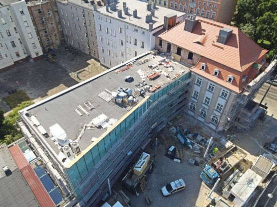 – Najbardziej widoczną zmianą na budowie jest charakterystyczna szklano-aluminiowa fasada łącznika, której montaż prowadzony jest od kilkunastu dni. Wewnątrz obiektu prowadzone są prace instalacyjne i wykończeniowe. Wykonane zostało pokrycie stropodachu, na którym montowane są urządzenia obsługujące instalacje sanitarne – informuje Piotr Zieliński, rzecznik prasowy spółki Szczecińskie Inwestycje Miejskie. – Spore zmiany zaszły również na remontowanej kamienicy. Widoczna jest zewnętrzna elewacja, wykonane zostało pokrycie dachu. Wewnątrz prowadzone są prace wykończeniowe i instalacyjne.
