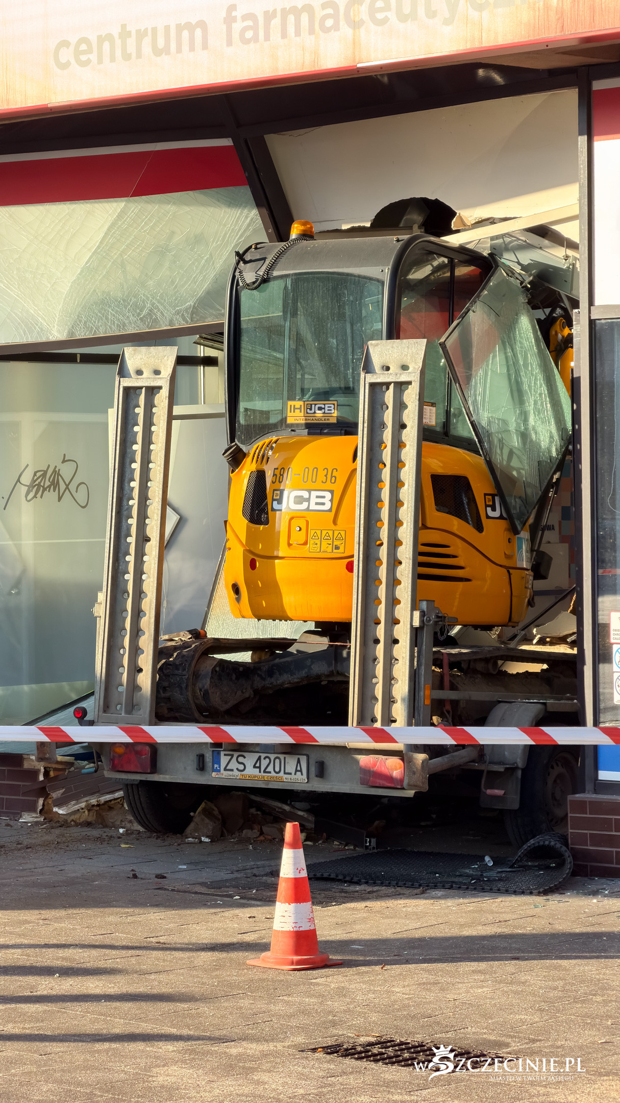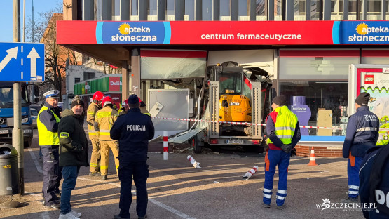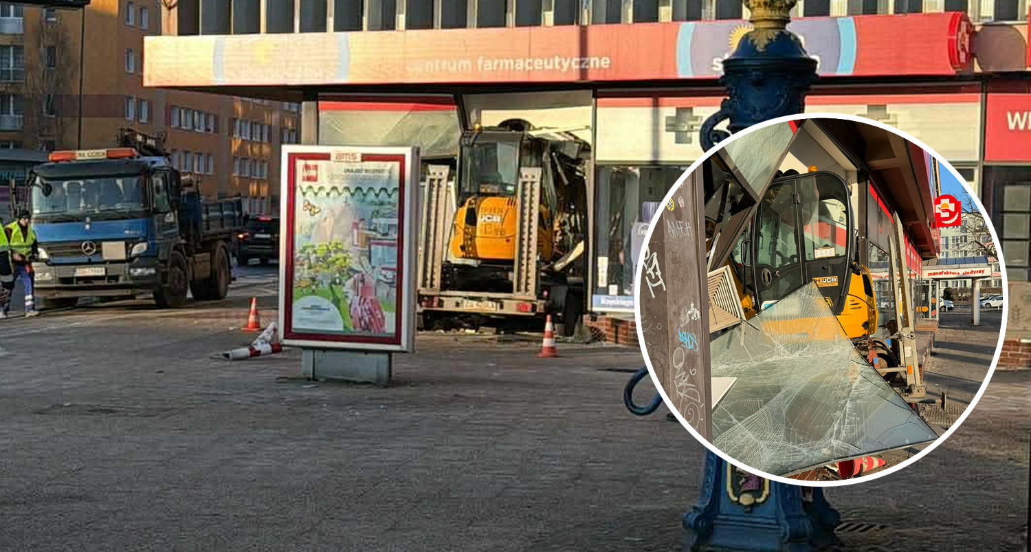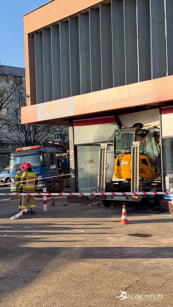 Z nieustalonych jeszcze przyczyn przyczepa odczepiła się od samochodu i uderzyła w witrynę apteki zlokalizowanej w budynku Cezasu w centrum miasta. Przewożona na niej była koparka.