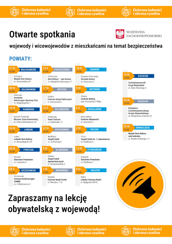 Zaplanowano 21 otwartych spotkań w każdym powiecie (ich terminy są na plakacie zamieszczonym pod tym artykułem). W ich trakcie wojewoda lub wicewojewodowie oraz komendanci powiatowych komend PSP w regionie spotkają się z mieszkańcami.