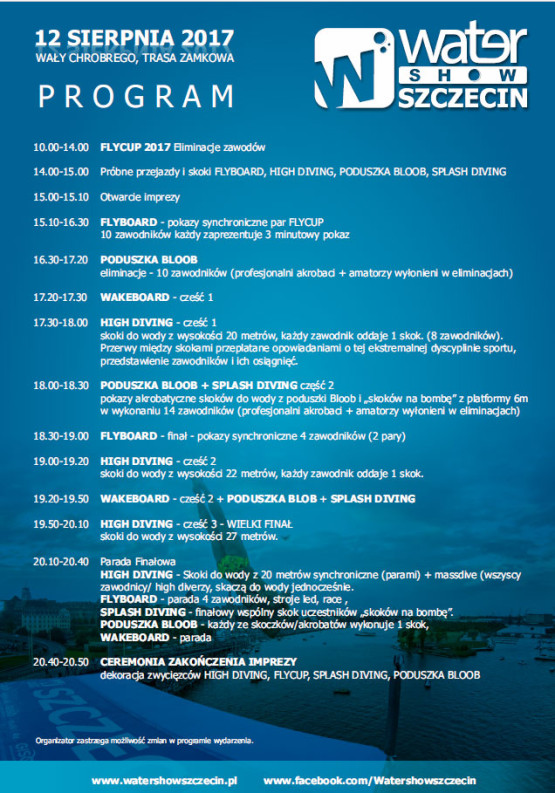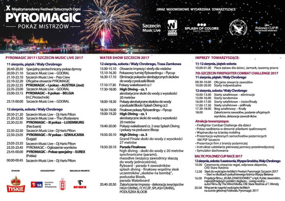 W drugi weekend sierpnia szczecinianie i turyści będą mogli oglądać także widowiskowe zmagania strażaków z całego świata rywalizujących w zawodach Firefighter Combat Challenge. W sobotę, 12 sierpnia, odbędzie się także druga edycja imprezy Water Show Szczecin, w ramach której będzie można podziwiać spektakularne skoki z Trasy Zamkowej do Odry. Zawodnicy będą skakać z wysokości 20, 22 i 27 metrów! W programie zaplanowano także pełne oszałamiających akrobacji pokazy latania nad wodą na flyboardach, wakeboardach oraz nową atrakcję w postaci "poduchy katapulty".