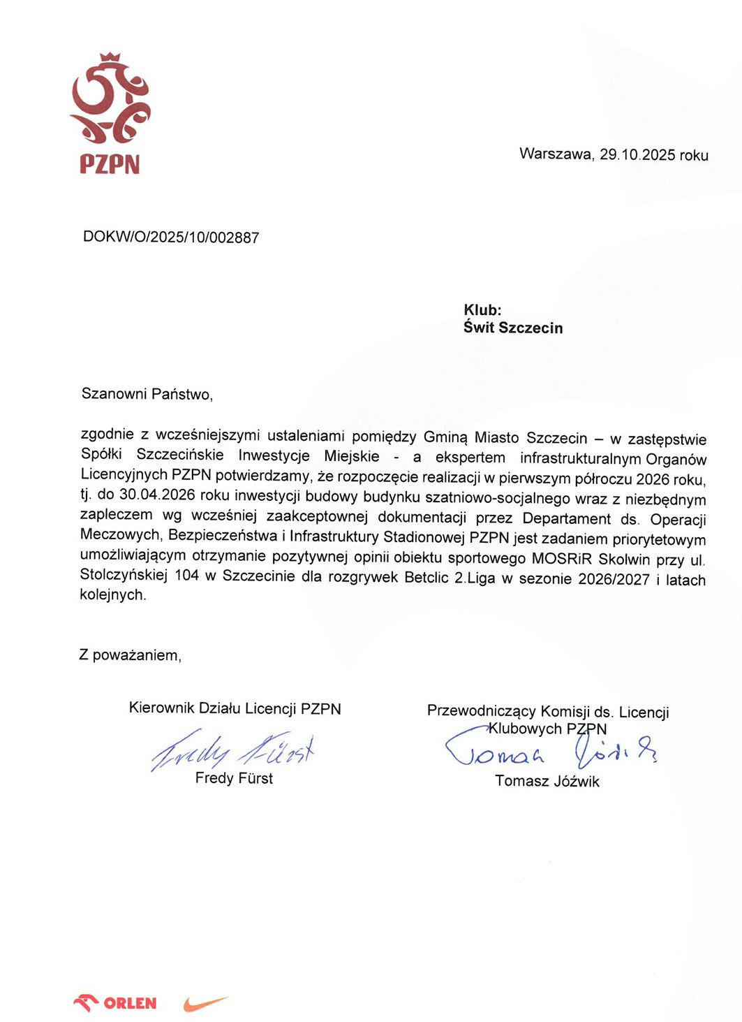 „Potwierdzamy, że rozpoczęcie realizacji w pierwszym półroczu 2026 roku, tj. do 30.04.2026 roku, inwestycji budowy budynku szatniowo-socjalnego wraz z niezbędnym zapleczem, według wcześniejszej zaakceptowanej dokumentacji przez Departament ds. Operacji Meczowych, Bezpieczeństwa i Infrastruktury Stadionowej PZPN jest zadaniem priorytetowym umożliwiającym otrzymanie pozytywnej opinii obiektu sportowego MOSRiR Skolwin przy ulicy Stołczyńskiej 104 w Szczecinie dla rozgrywek Betclic 2. liga w sezonie 2026/2027 i latach kolejnych” – napisał PZPN.