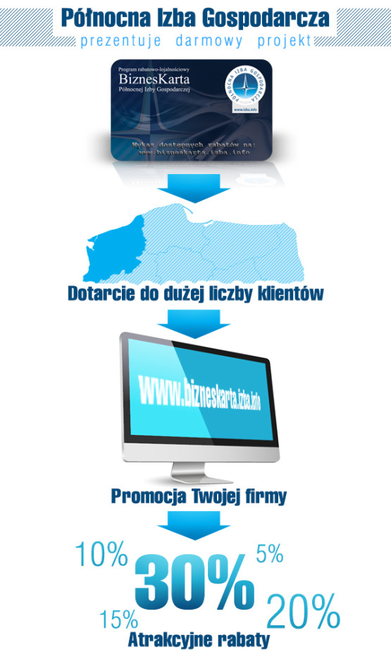 Każda firma zrzeszona w Izbie, która zgłosi swój udział w projekcie „Biznes Karty” może przedstawić ofertę rabatową na swoje usługi, która będzie intensywnie promowana na portalu internetowym oraz przy pomocy newslettera wysyłanego do szerokiego grona odbiorców (właścicieli kart rabatowych).