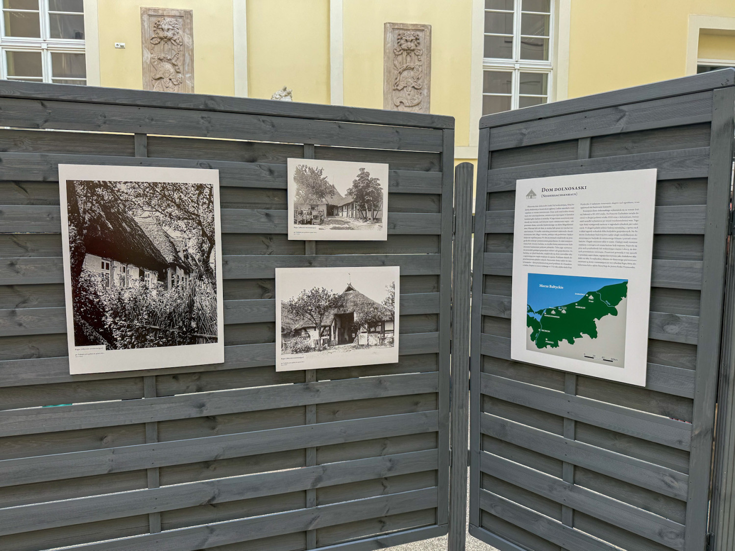 Na wystawie najwięcej jest fotografii przedstawiających domy dolnosaskie (saskie): duże budynki kryte strzechą, wzniesione w konstrukcji ryglowej, z szerokim wjazdem. Ludzie mieszkali w nich wspólnie ze swoim inwentarzem. Ponad połowę powierzchni takiego domu zajmowała długa i wysoka sień, a po jej obu stronach znajdowały się przegrody dla zwierząt. Za sienią usytuowana była kuchnia, a na tyłach domu mała część mieszkalna.