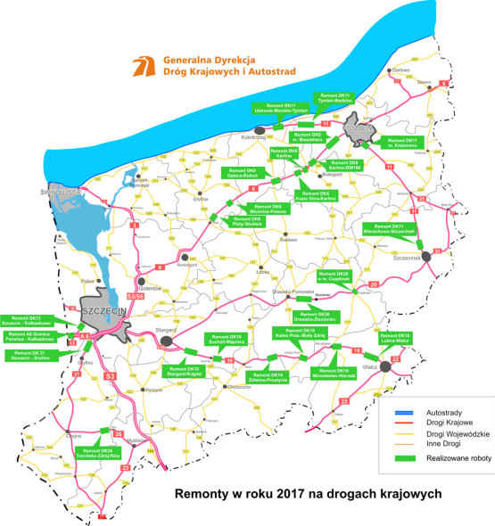 Remonty objęły również drogi nr 6 i 11. W przyszłości zostaną one zastąpione przez nowo budowaną drogę S6. Zmodernizowano także odcinek DK nr 31 Gryfino – Szczecin prowadzący przez Radziszewo i Daleszewo. Nowa nawierzchnia pojawiła się też na prawie całym odcinku DK 13 od Szczecina do Kołbaskowa i obu jezdniach autostrady A6 od węzła Kołbaskowo do granicy państwa.