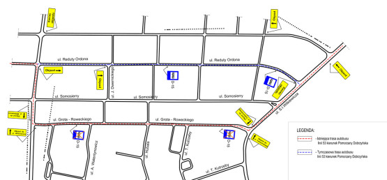 Cały czas objazdem w kierunku Pomorzan musi kursować linia autobusowa 53. Jedzie ul. Reduty Ordona, omijając przystanki„Berlinga” i „Roweckiego”. Zamiast tego zatrzymuje się na przystankach wspólnych z linią 75 – „Chłopickiego” i „Wita Stwosza”. Rozkład jazdy się nie zmienił. Kompleksowa przebudowa ul. Grota Roweckiego kosztować będzie 7,2 mln zł. Wykonawcą jest konsorcjum firm BEN-BRUK. Prace powinny się zakończyć w połowie lipca 2020 r.