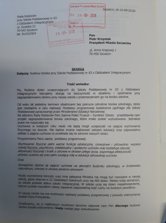 Te i inne argumenty Rady Rodziców znalazły się w piśmie adresowanym do prezydenta Piotra Krzystka. To skarga na bezczynność w działaniu i opóźnienia przy zagospodarowaniu terenu przy szkole. Rodzice domagają się odpowiedzi na pytanie dlaczego remont został wstrzymany i kiedy ich dzieci będą mogły ćwiczyć na zmodernizowanym boisku.