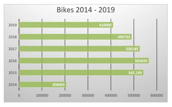 410 tys. to liczba wypożyczeń roweru miejskiego w roku 2019. Nie licząc pierwszego, trwającego zaledwie cztery miesiące sezonu, to najgorszy wyniki w historii Bike_S. W poprzednich latach liczba wypożyczeń wynosiła ok. 0,5 mln. Najlepszy był rok 2016, kiedy Bike_S wypożyczono 565 tys. razy.