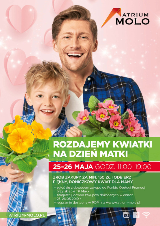 Akcja „Rozdajemy kwiatki na Dzień Matki” w Atrium Molo odbędzie się w dniach 25-26 maja. Rejestracji dowodów zakupu można dokonać w godzinach 11:00-19:00 w Punkcie Obsługi Konkursu, zlokalizowanym przy sklepie TK Maxx.