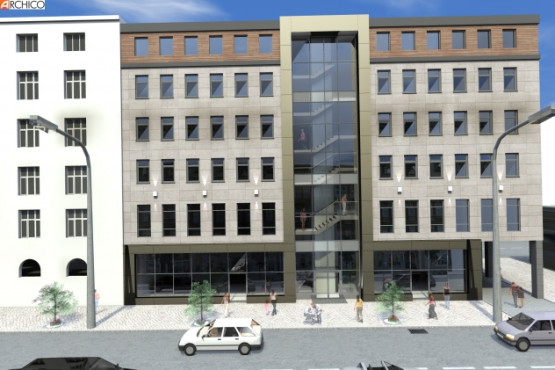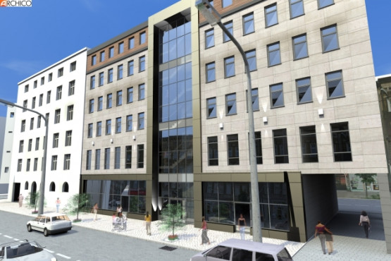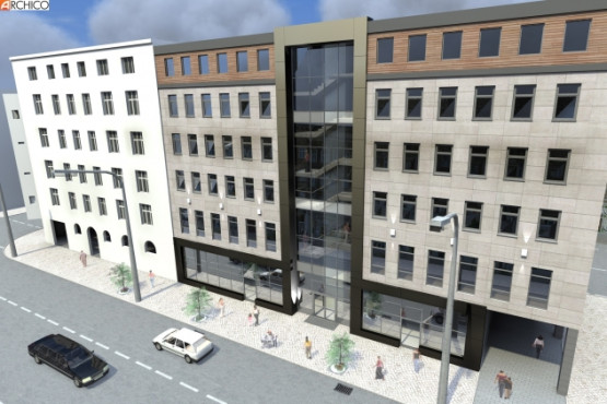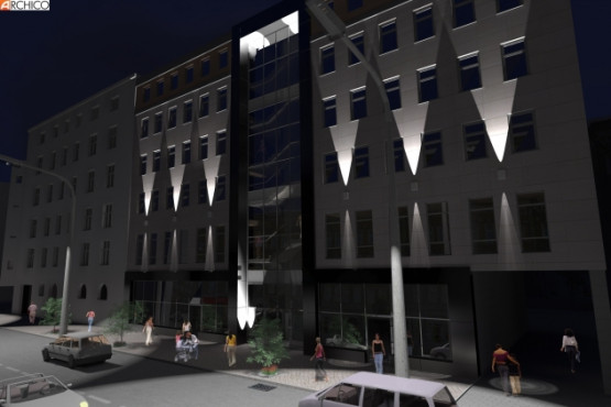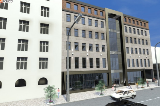 Jak zapewniają przedstawiciele biura ArchiCe, które zaprojektowało budynek, obiekt będzie wpasowany w istniejącą zabudowę. W strefie wejścia będzie zastosowane szklenie fasadowe na całej wysokości budynku, co pozwoli na wprowadzenie windy panoramicznej (z przeszkloną ścianą). Projektowane elementy wykończeniowe elewacji to kamień, szkło barwione oraz blachy perforowane - całość będzie oszczędna w formie i podkreślona szlachetnymi materiałami oraz iluminacją świetlną.