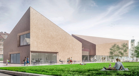 Z górnej kondygnacji będzie można przejść na otwarty taras, który znajdzie się nad holem wejściowym. Będzie on pełnił również funkcję zewnętrznej sceny z miejscem przeznaczonym na widownię lub np. forum do spotkań czy organizowania kameralnych wydarzeń plenerowych.