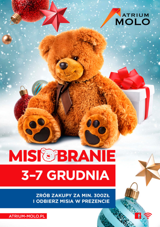 Z myślą o klientach planujących świąteczne prezenty, Atrium Molo przygotowało wyjątkową akcję – „Misiobranie”. Pluszaka otrzyma każdy, kto zrobi zakupy w sklepach w Atrium Molo na kwotę minimum 300 zł oraz zgłosi się z dowodem zakupu do Punktu Obsługi Promocji, umieszczonego w okolicy sklepu TK Maxx.