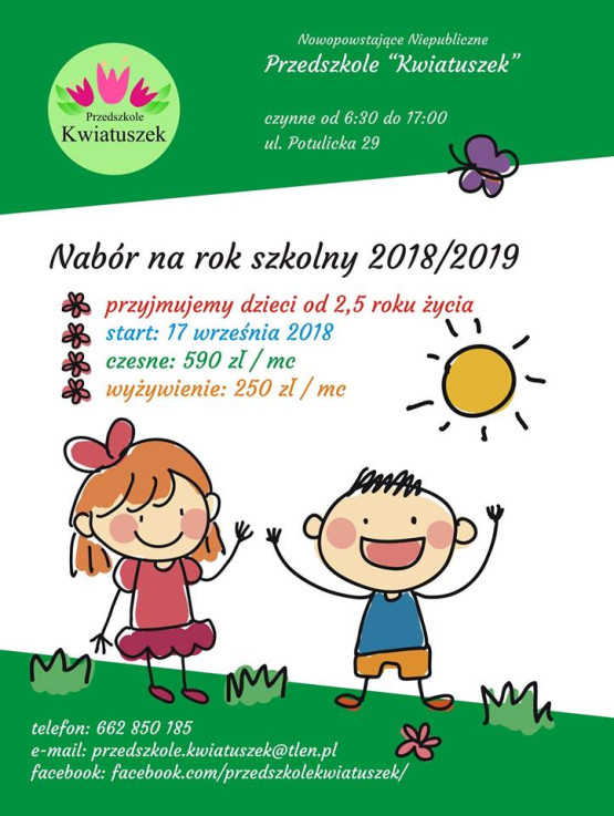 W „Kwiatuszku" jest stała cena, bez żadnych dopłat. W roku szkolnym 2018/2019 czesne wynosi tylko 840 złotych (590 zł + 250 zł wyżywienie). Tyle kosztuje pobyt dziecka w placówce od poniedziałku do piątku w godzinach 06:30 - 17:00.