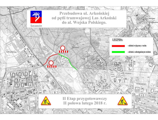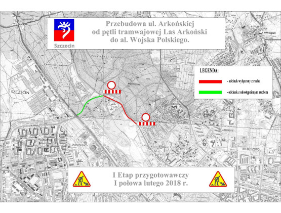 Pierwszy etap prac potrwa ok. dwa tygodnie. Po tym czasie fragment ul. Arkońskiej od ul. Wojciechowskiego do zjazdu na parking Arkonki będzie już przejezdny. Zamknięty zostanie natomiast fragment od al. Wojska Polskiego do zjazdu na parking Arkonki.