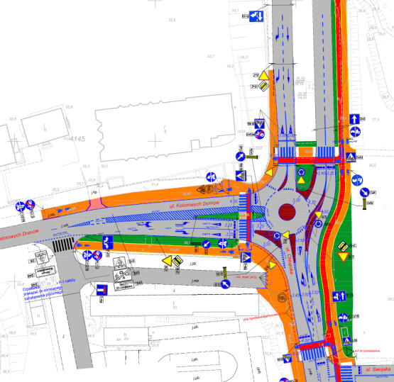 Przebudowa ma poprawić bezpieczeństwo i płynność ruchu w związku z czym na skrzyżowaniu ulic Kolorowych Domów, Chłopskiej i Swojskiej wytyczone zostanie rondo z przejezdną wyspą centralną oraz wyspami kanalizującymi.