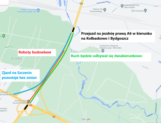 „Objazd do Stargardu będzie poprowadzony przez Szczecin za pomocą, wyłączonej obecnie z ruchu, łącznicy relacji Kołbaskowo - Szczecin. W związku z zamknięciem łącznicy, wyłączony z ruchu zostanie również zjazd ze Szczecina w kierunku Gdańska i Świnoujścia. Objazd dla tej relacji poprowadzony zostanie przez węzeł Podjuchy, poprzez łącznicę Szczecin – Kołbaskowo” – czytamy w komunikacie Generalnej Dyrekcji Dróg Krajowych i Autostrad.